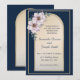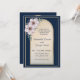 Invitación de boda moderna elegante azul marino con el marco dorado y rosas.