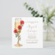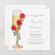 Invitación de chaparrón nupcial de champán con rosas rojas. Nombre en escritura moderna roja. Texto dorado. Imagen de acuarela. Chaparrón nupcial rojo. Chaparrón de rosas rojas. Fondo blanco.