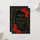 Invitación de oro y de cumpleaños negro con rosas rojas tradicionales vibrantes y tipografía de escritura clásica