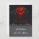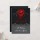 La invitación solo de recepción tiene una estética gótica y romántica llamativa. Una prominente rosa roja toma el centro del escenario en la parte superior, goteando un líquido rojo intenso sobre un fondo en forma de corazón. El fondo negro está adornado con un intrincado patrón de damasco que realza el ambiente dramático. Debajo de la rosa, hay una decoración plateada con aspecto de encaje que añade elegancia y divide la tarjeta en dos secciones. La mitad inferior presenta un fondo con patrón de damasco gris con elementos de diseño sofisticados en rojo y blanco. Emana encanto y misterio mientras mantiene un aire de refinamiento.