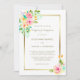 Aquí hay una invitación a la boda de bonito que presenta un colorido ramo de acuarela de rosas rosas rosas rosas rosas, melocotones y amarillas pálidas con vegetación en la parte superior izquierda. Una imagen más pequeña de coordinación está en la parte inferior derecha. Ambas imágenes están colocadas sobre un brillante marco dorado. Su texto personalizado está en oro oscuro en el centro. Todo ello sobre un elegante fondo blanco. La parte posterior de la invitación es oro, que coincide con el color del texto. ¡Apropiado e impresionante para los bodas en cualquier temporada! Asegúrese de ver la tarjeta RSVP correspondiente y otros productos bodas en nuestra tienda.