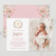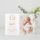 Esta hermosa invitación al bautismo cuenta con una corona de hermosos rosas de acuarela rosa con hojas verdes y falsos acentos de oro rosa, con una falsa cruz de oro en el centro. La foto de su bebé aparece en la tarjeta, junto con el guión escrito a mano en falso oro rosa. La parte trasera de la tarjeta es de color rosa suave, con ramos de flores en las esquinas.