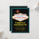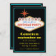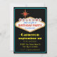 Esta invitación a un partido personalizado incluye un tema retro de Las Vegas sobre un fondo negro. En el centro está impreso el clásico cartel de "Bienvenido a Las Vegas". Puede personalizar el texto del signo para incluir su propia información de fiesta. Un borde azul neón encuadra la invitación. El texto de abajo está impreso en una fuente de neón amarillo.