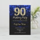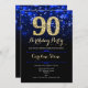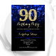 90.ª invitación a la fiesta de cumpleaños. Elegante diseño azul real con falso oro purpurina. Cuenta con diamantes elegantes, luces de bokeh y fuente de guiones. Invitación de cumpleaños de hombres o mujeres. Perfecto para una elegante fiesta de cumpleaños. Personaliza con tus propios detalles. Mándame un mensaje si necesitas más personalización. Invitaciones Zazzle impresas o una plantilla imprimible digital de descarga instantánea.