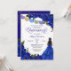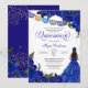 Invitación quinceanera en rosas reales azules con acentos dorados y un chica con elegante vestido de pelota. Consulte la tienda para ver esta invitación con chicas de diferentes colores de cabello y tonos de piel.