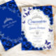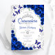 Royal blue silver and white Quinceanera celebration invitation. Features, script font, silver butterflies, watercolor roses and tiara. Perfect for an elegant princess style glam celebration. Personalize with your own details. Printed Zazzle invitations or instant download digital printable template.