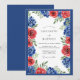 This design features a striking contrast of bold crimson roses and deep sapphire blue hydrangeas. Soft watercolor brushstrokes create a rich floral arrangement against a clean white backdrop. Lush green foliage adds a natural touch to the vibrant primary color palette. The aesthetic is both classic and spirited, perfect for a high-summer event.