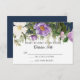 Flores antiguas de lavanda, púrpura y marfil con hojas verdes esmeralda profundas en una Tarjeta de Respuesta RSVP | Arte botánico vintage de flores de jardín con hojas de helecho silvestre recogidas en el bosque y follaje. El reverso tiene un fondo azul marino. Derechos de autor, Audrey Jeanne Roberts.