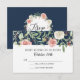 Tarjeta de respuesta RSVP | combinaciones con la boda Navy y Blush, Colección de Coronas de Rosa Marfil de Suites de invitaciones de boda. Acuarela floral pintada a mano con hojas y follaje del bosque de eucalipto verde. El reverso tiene un fondo azul marino con una corona floral que destaca el texto de caligrafía: Rsvp. Derechos de autor, Audrey Jeanne Roberts.