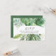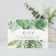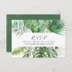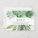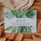 Esta salvaje tarjeta de recinto RSVP, imprimible o impresa en línea, es perfecta para una boda en la playa o destino. El diseño presenta una exótica variedad de hojas de plátano de palmera de color agua verde, helechos, follaje, plantas botánicas y vegetación para un ambiente tropical de verano.