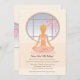 Sereno y relajado una hembra joven se sienta en una posición de la yoga. Detrás de ella una ventana de imagen grande con vistas a un árbol floreciente. Una invitación deliciosa para una fiesta de cumpleaños o cualquier acontecimiento de la yoga.