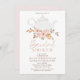 Invitación a la ducha de fiesta de té con de novia Rubor Brown Boho Floral Tea Fiesta Bridal Shower Invitation ofrece un arreglo floral de estilo boho con flores de color rubor y follaje marrón, así como un recipiente de té blanco. El encabezado de caligrafía es una imagen y se puede eliminar.