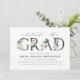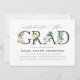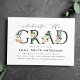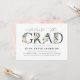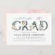 Elegantes y elegantes invitaciones a fiestas de graduación con letras grises de carbón vegetal con flores de color azul y toques verdes de follaje. Personalice las invitaciones a la fiesta de graduación floral añadiendo el nombre del graduado y los detalles del fiesta. El reverso de las invitaciones tiene un fondo color de agua rosa.