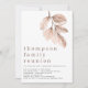 Rubor moderno deja a Fiesta de Reunión Familiar. La parte superior está decorada con hojas elegantes y la cabecera de la ocasión es grande en la parte inferior en una elegante minúscula con los detalles en la parte inferior. Personaliza fácilmente el texto a tus propios detalles.
