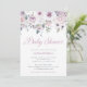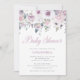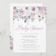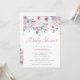 La acuarela hermosa de la característica de estas invitaciones de la fiesta de bienvenida al bebé las flores se ruboriza, suavemente del púrpura, y blancas con el un montón de hojas botánicas y de caligrafía purpúrea clara elegante.