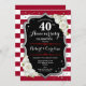 Invitación de cumpleaños de bodas de rubí rojo 40 aniversario. Tarjeta de invitación elegante roja, negra y blanca con falso brillo plateado. Cuenta con rayas elegantes, fuente de escritura y rosas blancas. Perfecto para una celebración de 40 aniversario.