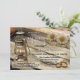 Engagement party invitation in a country style with a rustic wood table with lantern, rings and daisy flowers.