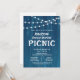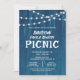 This rustic family reunion picnic invitation features a rustic blue background accented with strings of lights adorning the top of the invite.