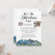 Que la aventura comience la invitación a la ducha de color acuático con temática rústica con el paisaje silvestre de bosque y montañas con tipografía de escritura caligrafía con corazón en el medio.