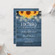 Luces de cuerdas de bonito y girasoles decoran los detalles especiales de la celebración de la fiesta de compromiso, ambientados en una tipografía elegante sobre un fondo azul rústico de madera. El reverso presenta las iniciales de su monograma colocadas dentro de un girasol a juego. Diseñado por Thisisnotme©