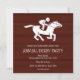 Gallop into the racing season with this stylish Annual Derby Party invitation. Featuring a rustic wood-panel background, a classic white jockey silhouette, and a playful horseshoe pattern on the reverse, this design perfectly captures the spirit of the track. Ideal for hosting a themed event with Mint Juleps and Derby attire, this customizable card ensures your guests save the date for the most exciting two minutes in sports.