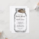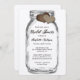 Rústica invitación a la ducha de novias con un frasco de albañil con dos corazones de burrega sobre fondo de papel kraft. Elementos coincidentes disponibles.