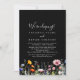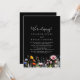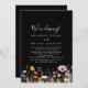 This rustic meadow botanical elopement reception card is perfect for a modern post elopement party. The design features seamless hand-painted yellow, navy, blue, yellow, pink, and blush wildflowers with botanical leaves in a black background.