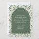 Celebrate your special day with this elegant sage green wedding invitation featuring a modern arch design surrounded by soft watercolor greenery. The front showcases your wedding details in clean, classic typography set against a deep sage panel, creating a beautiful contrast with the leafy botanical background.