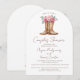 This Western Couples Shower Rustic Boots Elegant Arch Invitation features a beautiful watercolor illustration of worn leather cowboy boots surrounded by soft pink peonies, symbolizing love, joy, and a touch of country glam. The white background and arched card shape add modern sophistication, while the delicate script “Couples Shower” headline sets the tone for a joyful, fun-filled celebration.