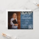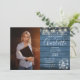 Invitación rústica a una fiesta de graduación con luces de cuerdas de bonito, tarros de albañil, un nombre de estilo y una tipografía moderna sobre un fondo de madera rústica azul, personalizada con su foto de grado y detalles de la celebración. Diseñado por Thisisnotme©