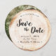Rustic wood Wedding Save the Date Photo Wood Grain Invitation—a blend of natural charm and romantic elegance, perfectly tailored to your rustic wedding theme. This unique round card captures the essence of wood grain, emulating the rustic disc slices often seen at beautiful and romantic weddings. A transparent white overlay is applied to keep the text readable.