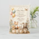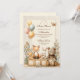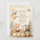 Celebre la próxima mamá con este rústico diseño de una ducha de bebé de bosques con zorro dulce, conejito y oso de peluche sentado en bloques de juguete de madera, rodeado de flores silvestres, mariposas y globos pastel. Un encantador tema campestre que se siente cálido, acogedor y perfecto para una celebración inspirada en el bosque.