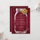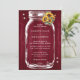 Invitación rústica a una boda borgoñona con un frasco de albañil adornado con un girasol sobre un fondo de madera de granero.
