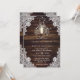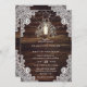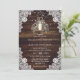 Invitación a una boda floral de madera rústica con flores del aliento de un bebé y una linterna sobre un fondo rústico de madera adornado con luces de cuerda y encaje floral blanco.
