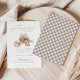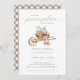 Invite a sus seres queridos a celebrar su ducha de bebé de otoño, ¡honrándote a ti y a tu pequeña calabaza! Este diseño presenta calabazas acuáticas en una rústica carretilla de madera con serif y tipografía cursiva manuscrita con un bonito fondo rústico de gingham.