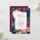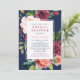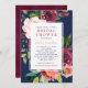 El diseño de esta invitación a la ducha de boda, rica y elegante, presenta un elegante texto enmarcado por un rústico verano y un diseño de acuarela florida de otoño con rosas, dahlias, flores de peón y vegetación en una espléndida paleta de rojo burdeos, amarillo dorado, naranja de melocotón, rosa rubor y tonos verdes con un fondo de medianoche/azul marino. Personalice el texto del personalizado con el nombre, el evento y la información del registro de la novia. Un fondo rojo burdeos y coordinado con una apariencia texturizada se viste por la parte de atrás de la tarjeta.