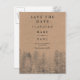 Envía tu tarjeta de guardar la fecha con esta boda de bosque de árboles de pino de otoño e invierno en kraft marrón rústico con árboles de pino negros que muestran un país de las maravillas del bosque, con tipografía elegante y moderna.