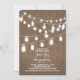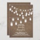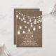 Romántica invitación a la ducha de novias con rústico burlap y luces de cuerdas con frascos colgantes de máscaras.