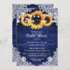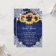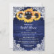 Elegante invitación a la ducha de novia con girasol rústico azul marino con girasoles sobre un fondo de madera de granero adornado con encajes florales blancos y luces de cuerda. Elementos coincidentes disponibles.