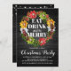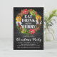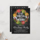 Invite a sus huéspedes a comer, beber y disfrutar de esta elegante y personalizada invitación a la fiesta de navidades rústicos. Diseñada con un fondo de madera negra, una corona de navidades tradicional de pinos, abetos, cintas, bayas de invierno y flores de poinsettia. ¡Para las luces de hadas de cuerda extra destartaladas están enredadas en la corona de flores creando ese mágico sentimiento de Navidad!
