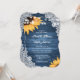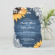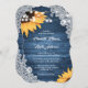 Esta rústica y polvorienta invitación a celebrar bodas azules con girasoles y encaje rústico sobre un fondo de madera de granero es perfecta para invitar a sus invitados a su rústica fiesta de bodas azul polvorienta inspirada en las flores de girasol.