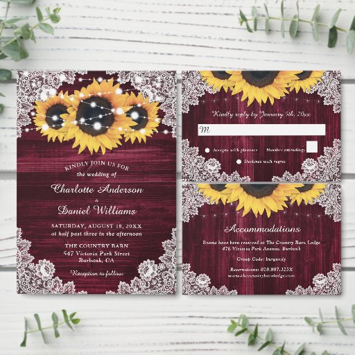 Elegantes invitaciones de boda de girasol ideal para una romántica fiesta de boda rústica burdeos inspirada en flores de girasol. Elementos coincidentes disponibles.