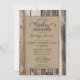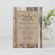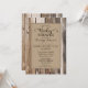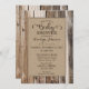 Diseño rústico de tarjetas de invitación a la ducha para bebés con un fondo de lino sobre tablas de madera de granero. El diseño de la parte posterior tiene grabado cardíaco y monograma sobre tablas de madera de grano.