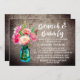 Este rústico tarro de albañil con un brunch de flores y una tarjeta de invitación burbujeante es perfecto para una ducha de novias con temática floral. El diseño presenta un elegante arreglo de peonías de acuarelas rosas y flores silvestres en un tarro de masón azul sobre un fondo texturado de madera.