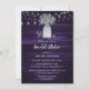 Hermosa personalizado, rústica y violeta invitación a la ducha de novias con flores de aliento de bebé dentro de un frasco de albañil contra un fondo de madera de granero adornado con luces de cuerda. Personaliza fácilmente estas adorables invitaciones a la ducha de novias púrpura con tus detalles del evento.