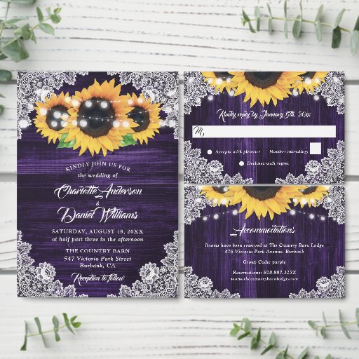 Complemente su rústico boda morado con estas elegantes invitaciones a la ducha con flores moradas con girasoles en un fondo morado adornado con luces de cuerda y encaje floral blanco. Elementos coincidentes disponibles.