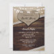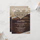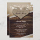 Rústica invitación a una boda campestre con una ducha de novias con un corazón de burrega contra un rústico bosque adornado con burlap, encajes y luces de cuerdas.