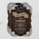 Invitación a la ducha de novias rústica personalizada con cinta de borregas y encaje floral blanco contra fondo de madera de granero. Elementos coincidentes disponibles.