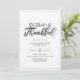 Un diseño simple con un enfoque en el extravagante encabezado de tipografía caligráfica que dice "Comer, beber y estar agradecido" sobre el fondo de un papel kraft, incluye una plantilla en la parte posterior para un mensaje adicional para amigos y familia.