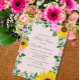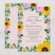 Invitación rústica a la ducha de bebé con girasoles vibrantes, daisias blancas tradicionales y flores rosadas contra un fondo rosa claro con el aliento del bebé y acentos de vegetación botánica